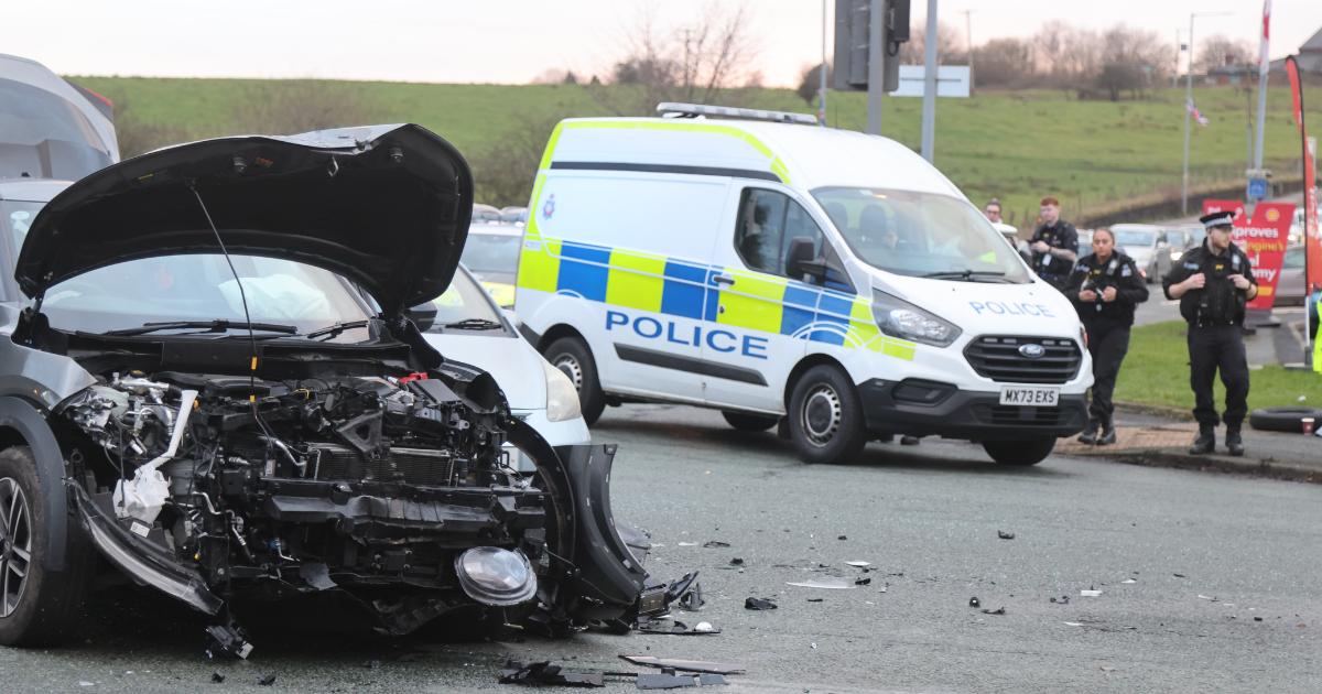One of the cars sustained heavy damage to the bonnet and passenger side, with debris scattered across the road.