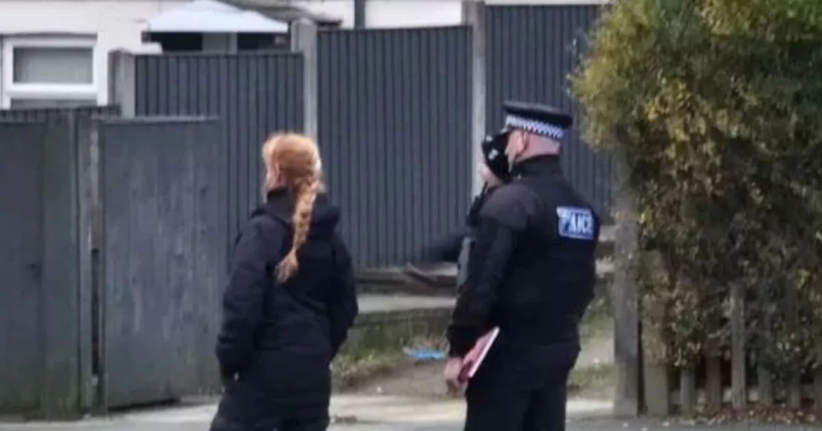 Police have been pictured examining a crash site where an overturned red vehicle has been left in the driveway of a home.