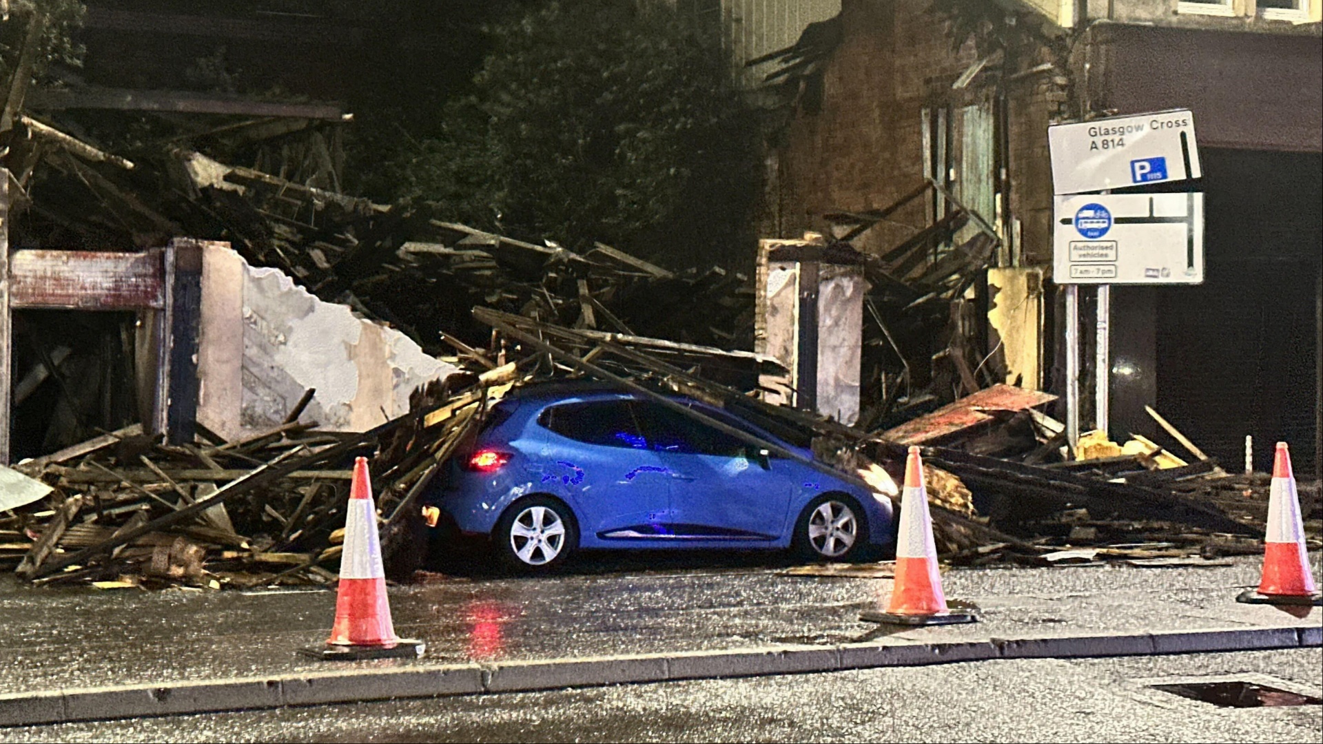 Debris from the derelict building has covered a light blue hatchback, with wood strewn over the road surface.