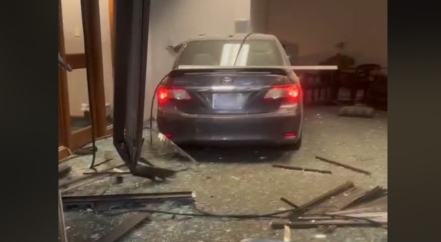 Witnesses tell us the gray Toyota Corolla crashed into the bank at about 7 p.m.