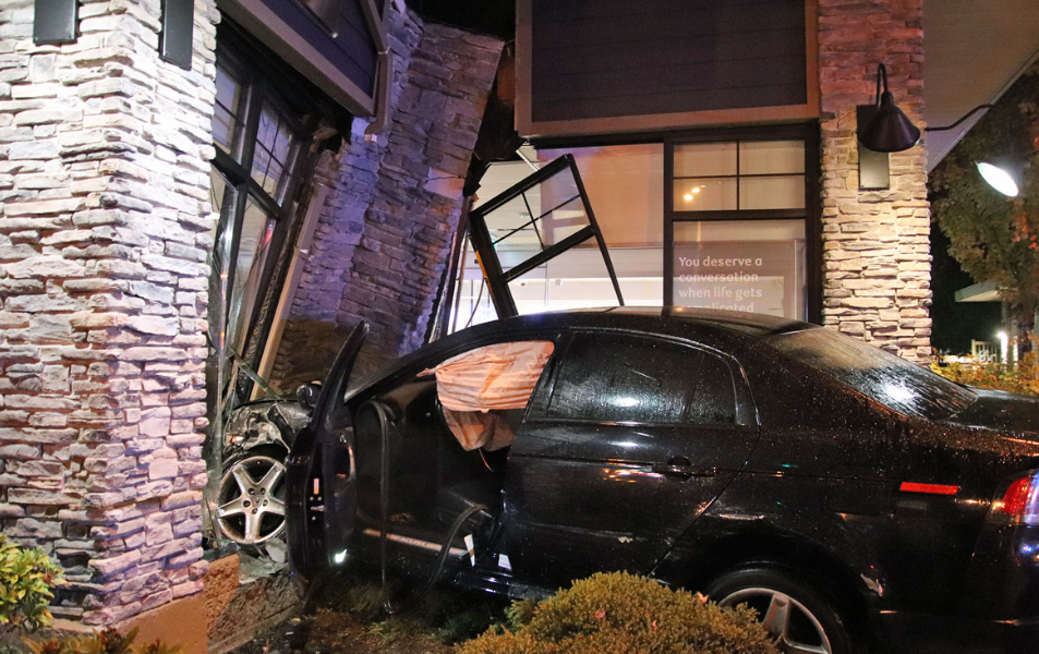 A two-vehicle crash resulted in a car smashing through the front of a bank Saturday evening, the Surrey Police Service (SPS) says.