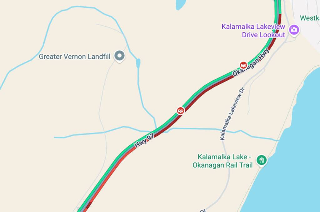 A crash closed northbound traffic on Highway 97 south of Vernon Saturday, Jan. 10, 2026. (Google Maps)