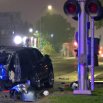 A blue Toyota SUV suffered major damage from the accident.