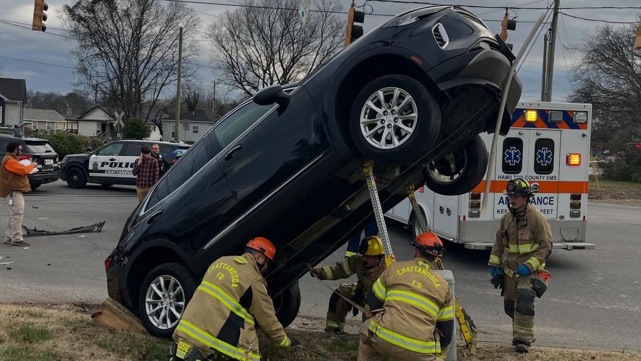 CHATTANOOGA, Tenn. — Chattanooga firefighters rescued a driver Tuesday who was suspended inside of their vehicle after a crash on Wilcox Boulevard.