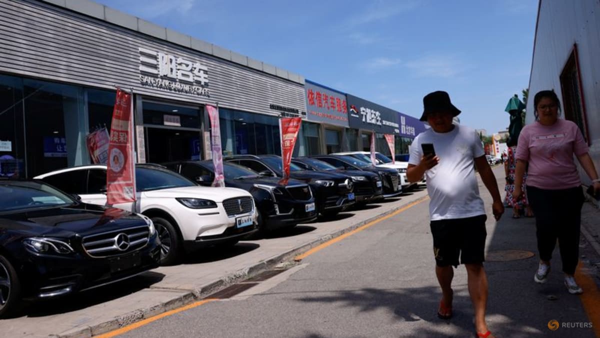 People walk past second-hand cars and dealerships at a used car market in Beijing, China, on Jun 6, 2025. (Photo: REUTERS/Tingshu Wang)