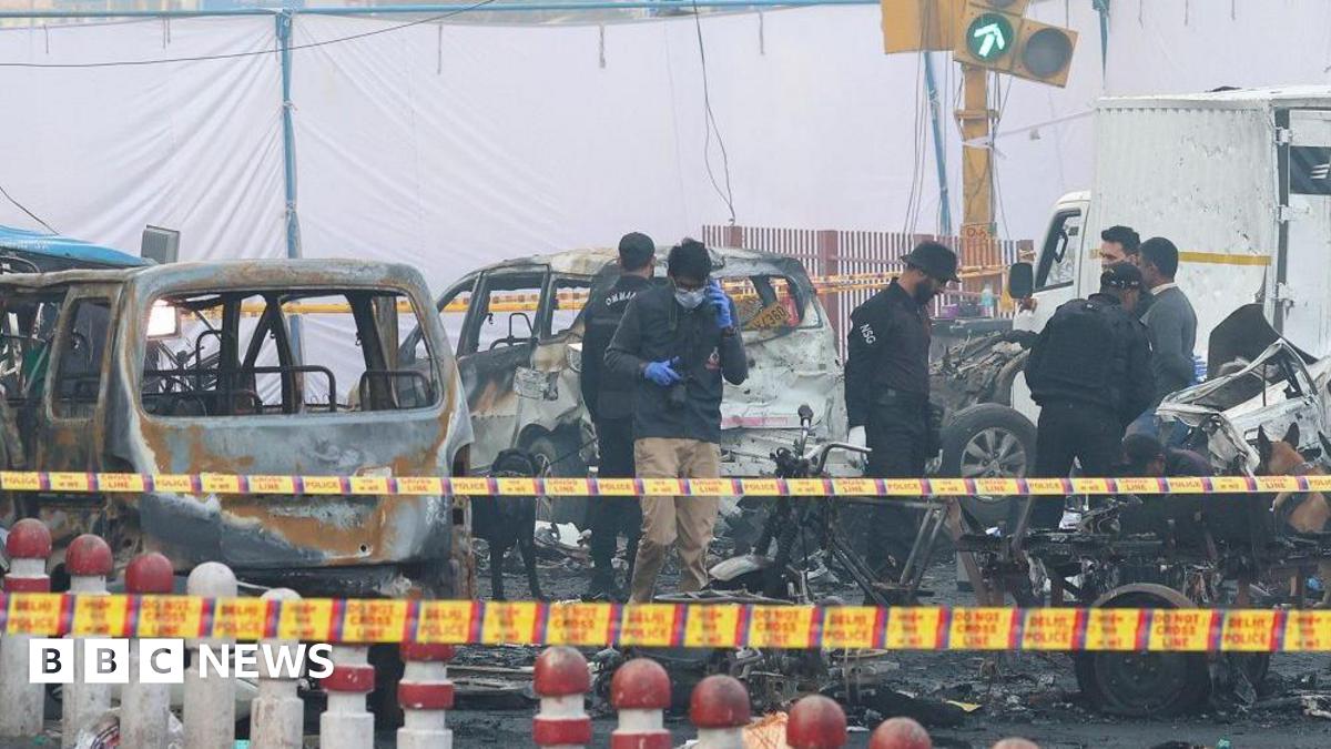 Pictures reveal the extent of the damage, with several destroyed vehicles still lining the road close to Red Fort.