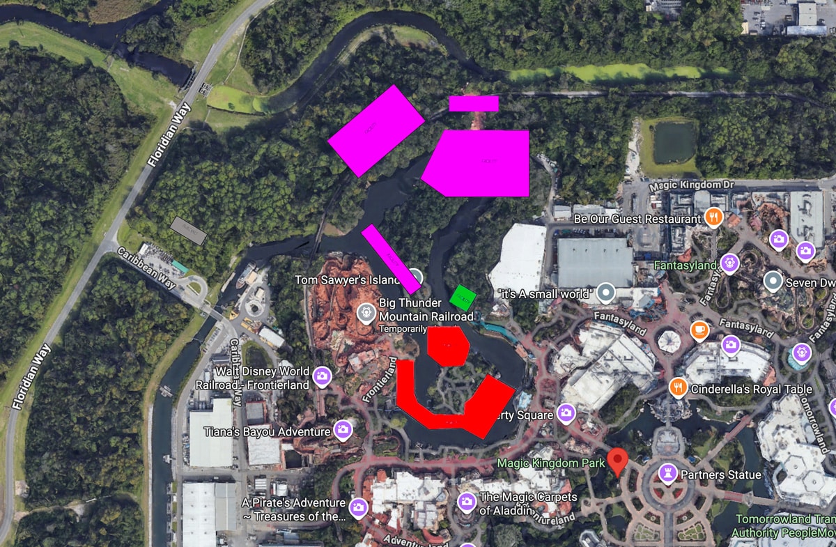 Somewhat notable for our purposes is that Walt Disney Imagineering has created a trailer park with field offices in a backstage area behind Big Thunder Mountain Railroad and Tiana’s Bayou Adventure in Magic Kingdom. Every time this appears on maps (like above on the far left) or aerial photos, some fans question whether Walt Disney World is going to have a new parking lot and guest entrance behind Magic Kingdom. No. Large as it might look, that parking lot is way too small for guests. (See Disney Files Construction Permit for Imagineer Trailer Park Near Cars Land at Magic Kingdom for more on this.)