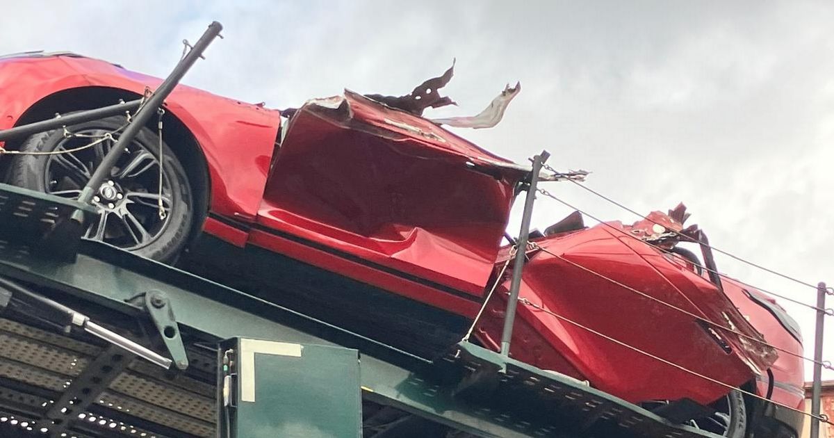 Photos show a red car on the transporter left badly damaged, with its roof entirely ripped off.