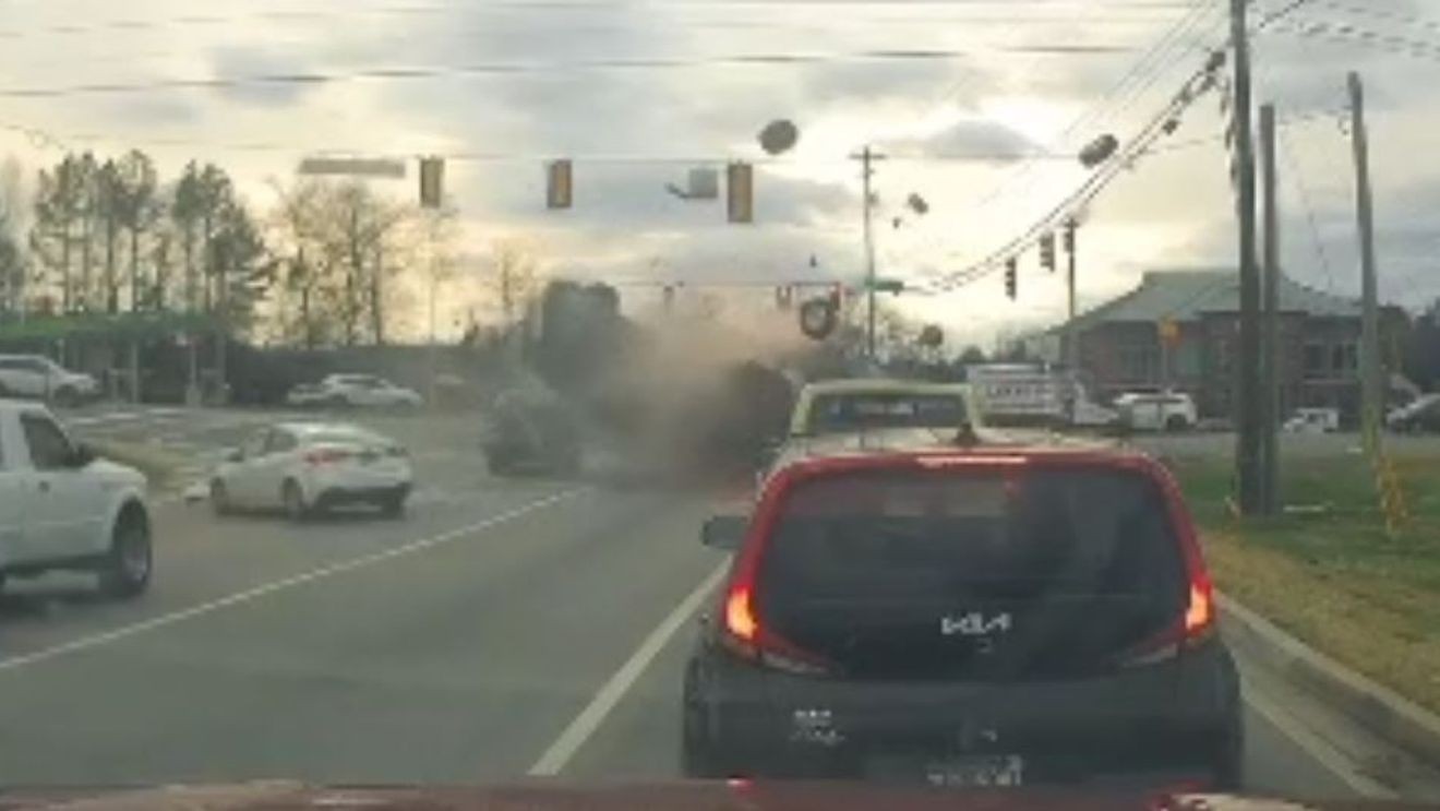 Dashcam video sent to us by viewer Grace Wilson shows a silver SUV slamming into traffic on Dietz Road in Catoosa County, triggering a violent chain reaction that sent one vehicle flipping through the air.