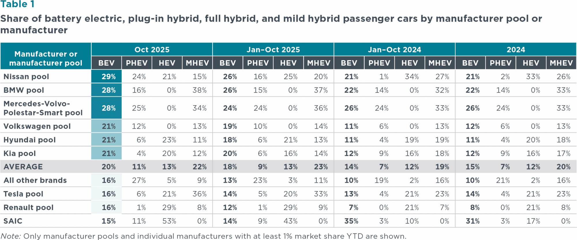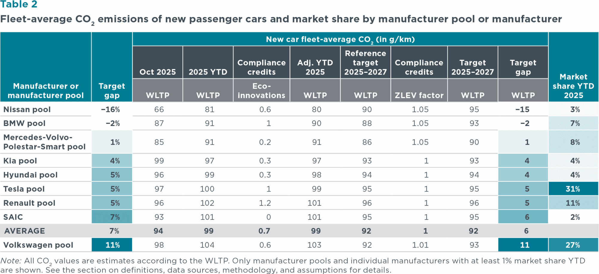 Carbon dioxide (CO2) emissions among manufacturer pools averaged 99 g CO2/km in 2025 YTD. Manufacturing pools thus remain 6 g CO2/km from the average target of 92 g CO2/km for the 2025–2027 period. Compared with the previous month, nearly all of the manufacturer pools reduced their target gap by 1 g CO2/km. The newly formed Nissan pool and the BMW pool are currently in compliance with their 2025–2027 targets (15 and 2 g CO2/km below the target, respectively), while the Mercedes-Volvo-Polestar-Smart pool is 1 g CO2/km short of meeting its target. The Volkswagen pool remains the furthest behind, exceeding its target by 11 g CO2/km.