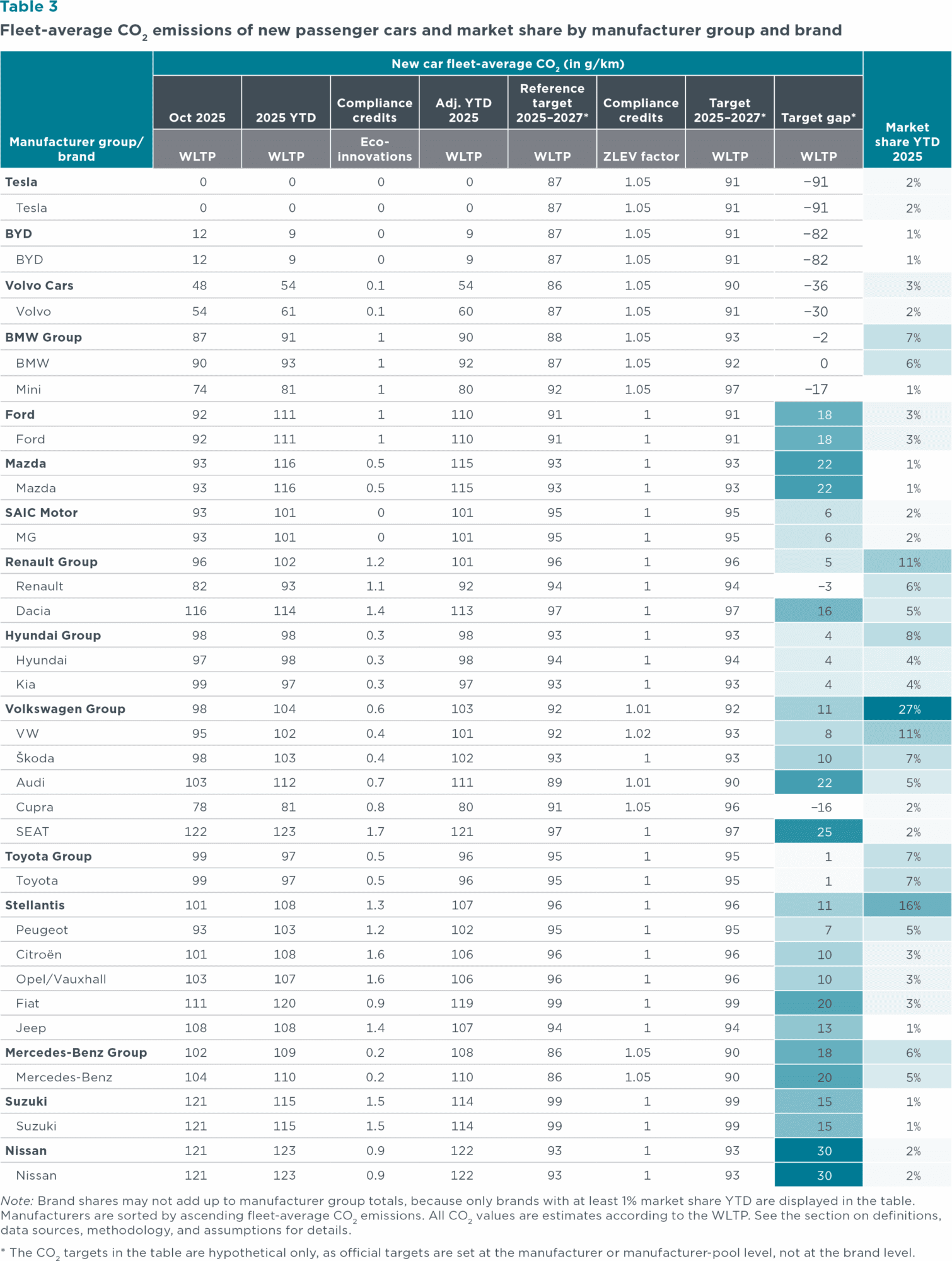 Looking at individual car brands with market shares of 1% or greater, Tesla and BYD had the greatest over-compliance at 91 and 82 g CO2/km below their projected brand-level average targets for 2025–2027, respectively, followed by Volvo (30 g CO2/km below), Mini (17 g CO2/km below) and Cupra (16 g CO2/km below). Nissan (30 g CO2/km above), SEAT (25 g CO2/km above), Mazda (22 g CO2/km above), and Audi (22 g CO2/km above) currently have the largest target gaps. Mazda reduced its target gap by 3 g CO2/km and Ford and MG reduced their target gaps by 2 g CO2/km each compared with the previous month.