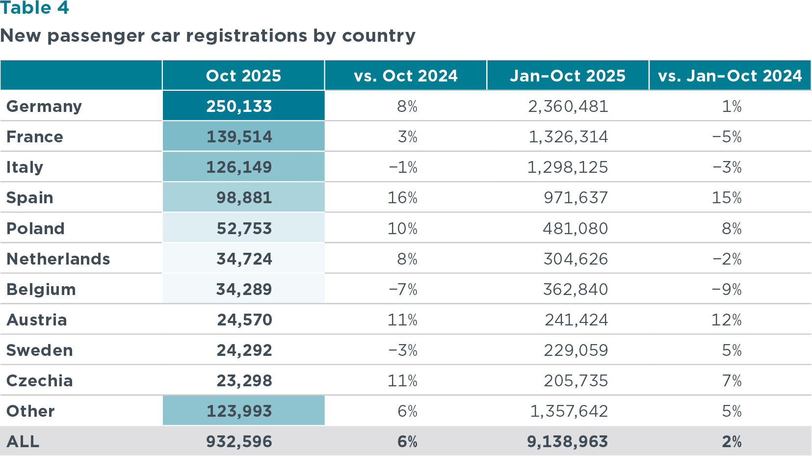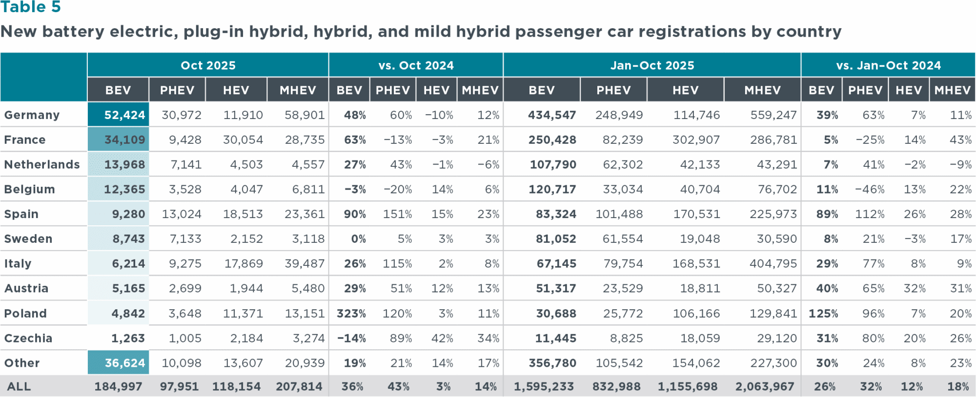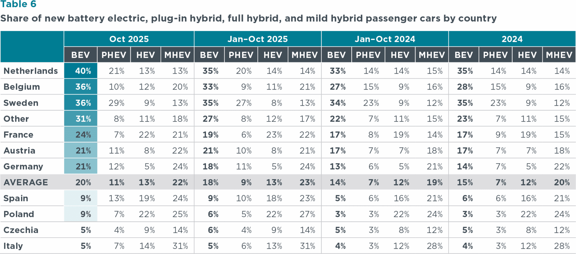 Poland, the fifth largest European market by new passenger car registrations, has seen a surge in electric vehicle (EV) uptake in 2025. Year to date, new BEV registrations more than doubled compared with the same period last year. In October 2025, BEVs accounted for 9% of new registrations, a historic high and 7 percentage points above October 2024. Year to date, the BEV market share stood at 6%, up 3 percentage points from the same period in 2024 (Figure 5). Although its BEV share remained below the European average, Poland has now surpassed other major markets—specifically Italy (the third largest) and Czechia (the 10th largest)—since the beginning of 2025.