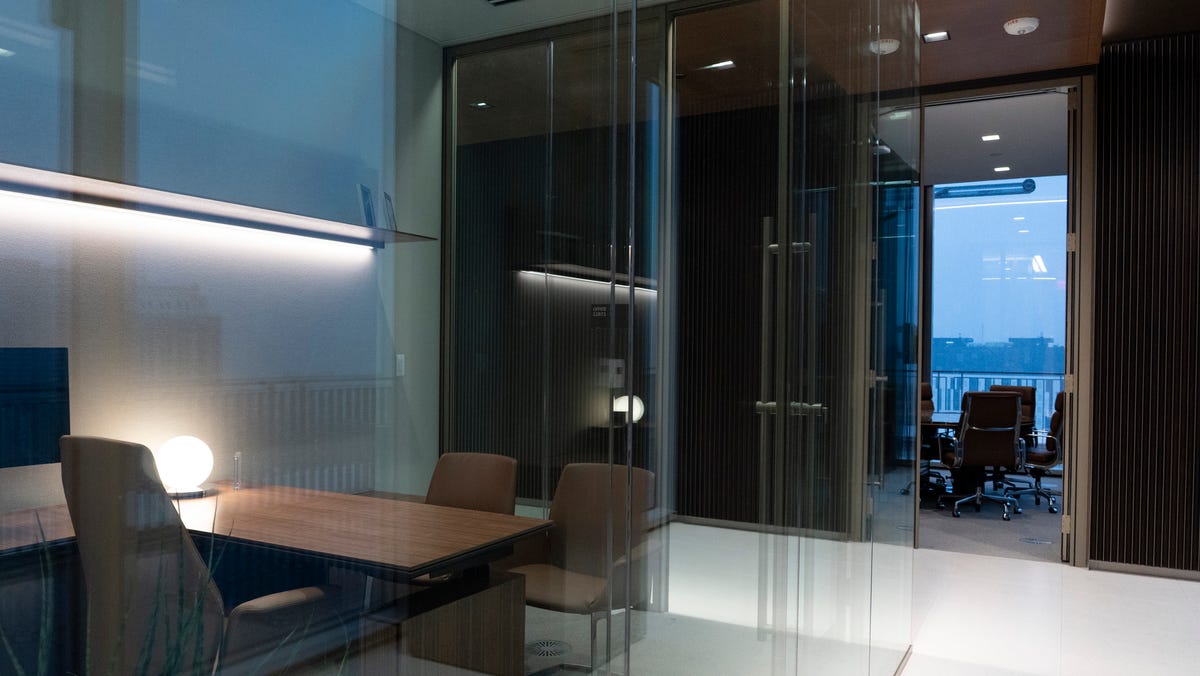 There’s plenty of tech upstairs as well. Mounted on the walls of each of the GM-leased floors are interactive flatscreen wayfinding displays from Cisco Spaces for indoor navigation. Employees can see at a glance of the virtual floor plan how many conference rooms are available and can book rooms via the screen.