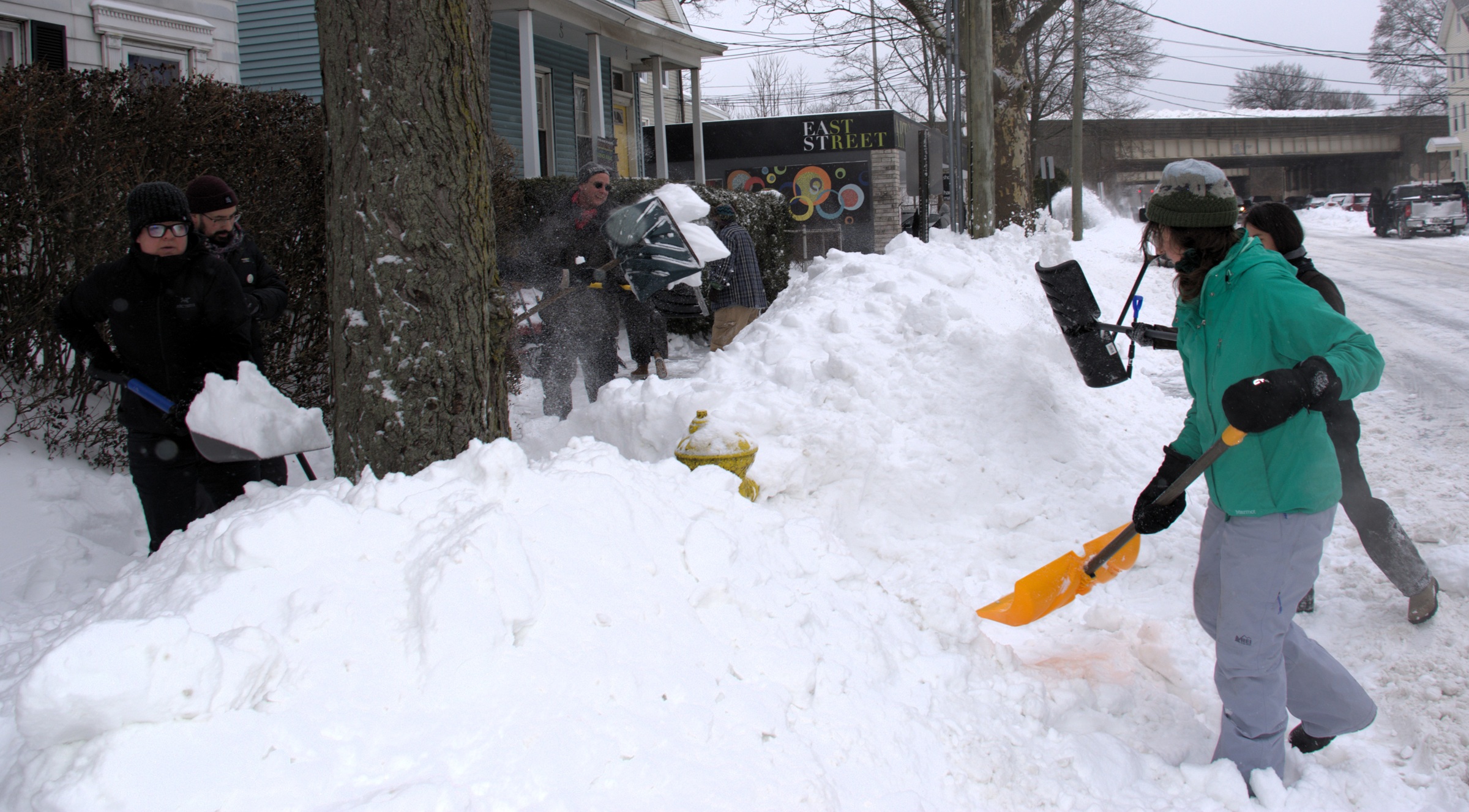 Smith, then, climbed over the powdered heap with shovels at the ready. “A couple of them might be ones that I acquired when I was in college,” Smith said of the shovels. She started organizing neighborhood snow diggers in 2014 as an undergraduate at Yale.