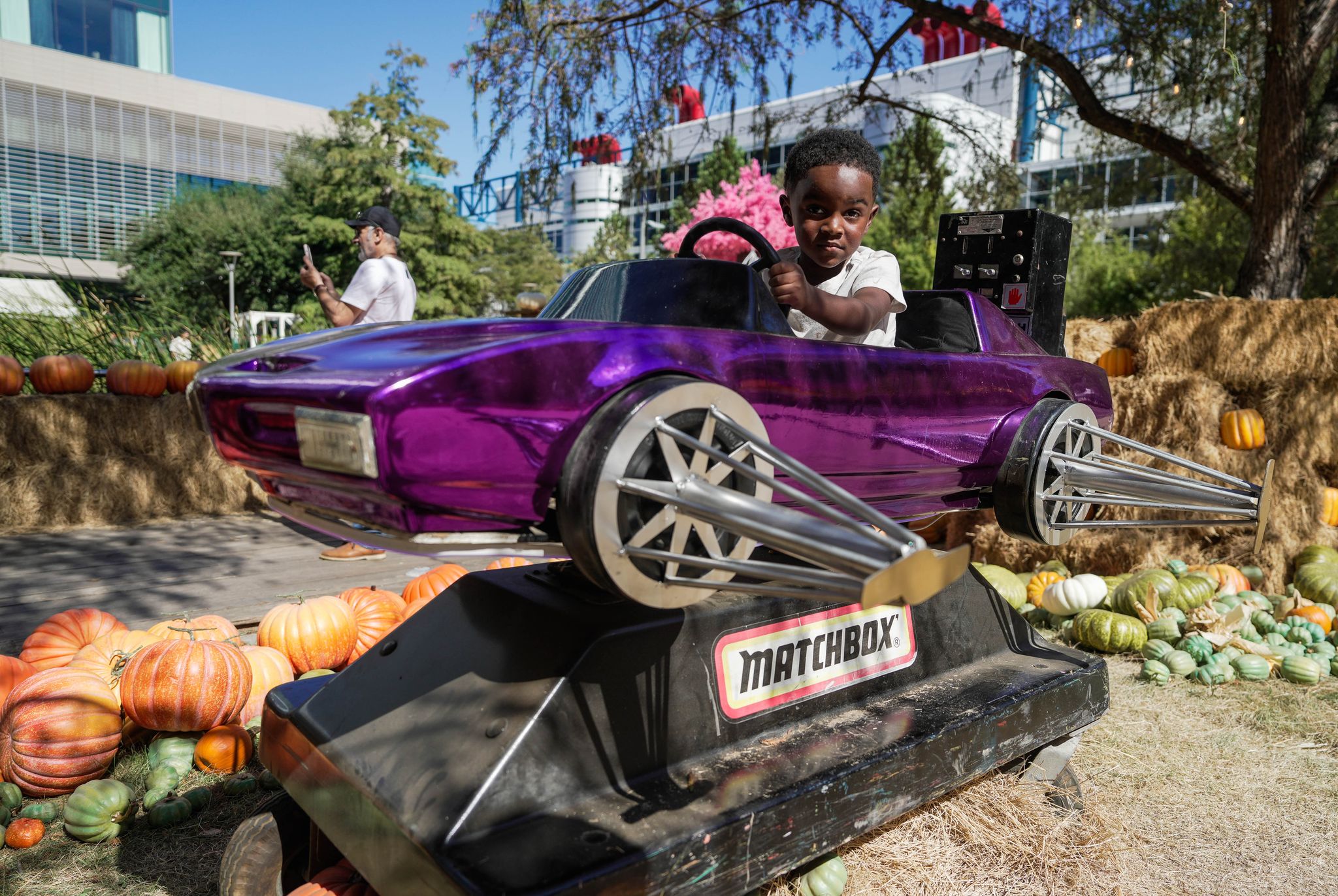 New for 2025 is a kid-size purple slab convertible surrounded by pumpkins. Created specifically for the festival by High Cut Tint, the car features swangas and rocks back and forth.