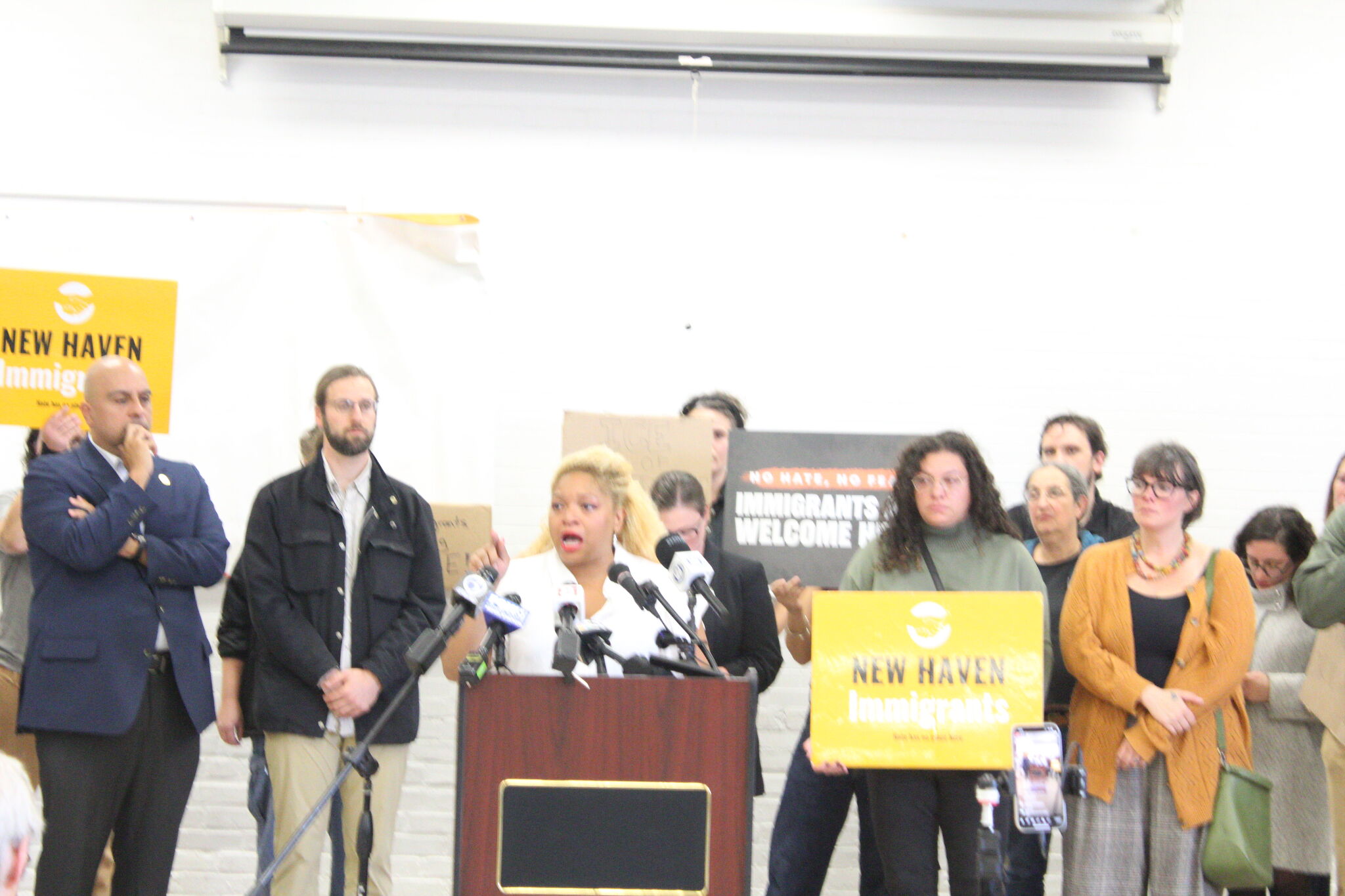 Town Council President Dominique Baez speaking at a New Haven Immigrants Coalition press conference along with local, state officials as well as pastors and organization leaders at the Keefe Community Center on Wednesday afternoon.