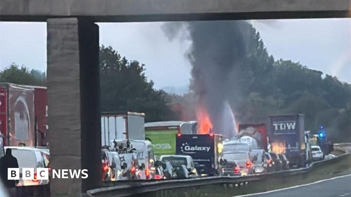 Emergency services said a car transporter carrying nine electric vehicles had caught fire on the southbound carriageway.