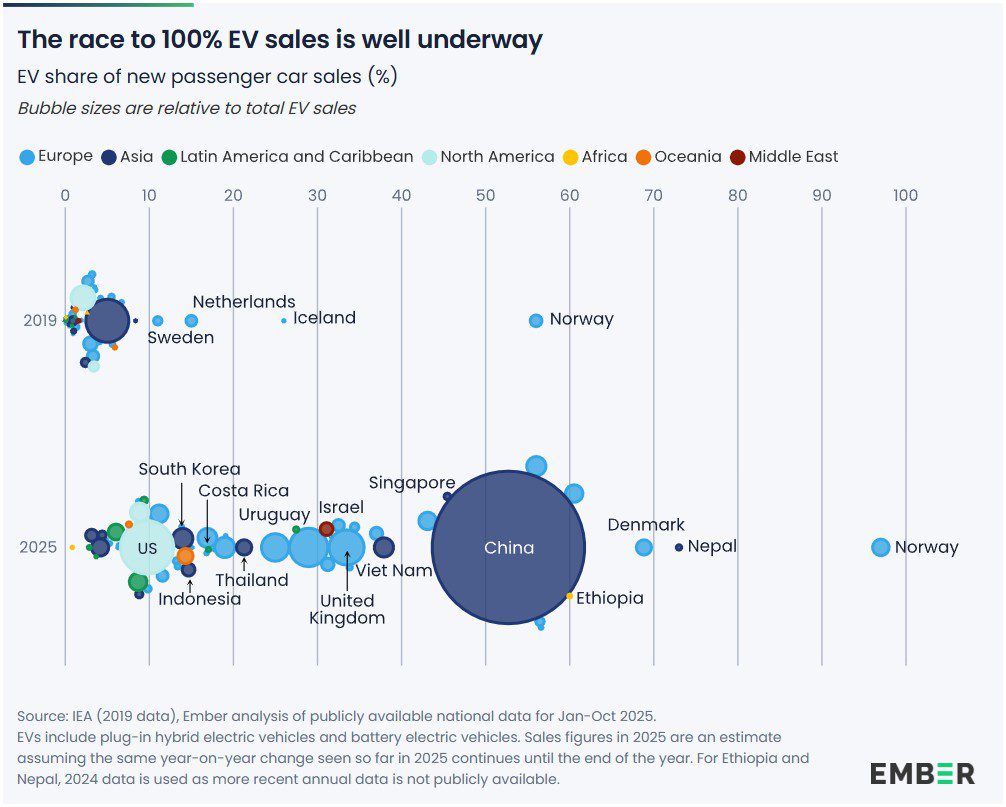Ember’s analysis focused specifically on the passenger car market, and where possible compared data across countries for the first ten months of the year, though some countries, such as Australia, Canada, and South Africa, data was only available for the first nine months of 2025.