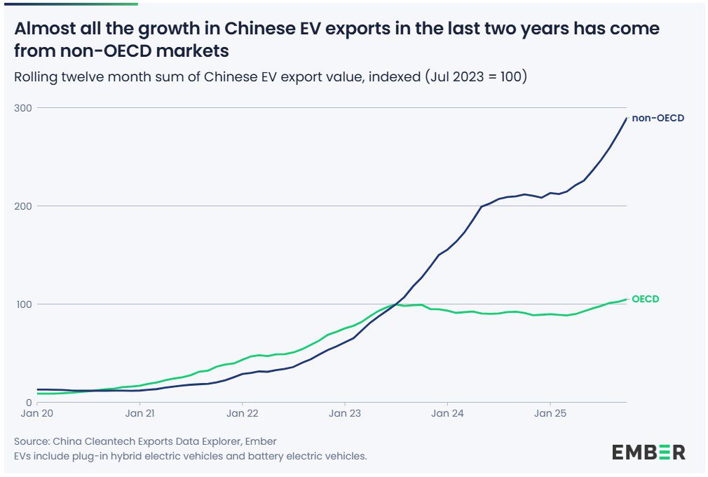 Importantly, Ember’s analysis has found that, since mid-2023, almost all the growth in the export of Chinese electrified vehicles has come from non-OECD markets. Brazil, Mexico, the UAE, and Indonesia are among the ten largest destinations for Chinese EV exports so far in 2025 thanks to top-down policies designed to support EV adoption.