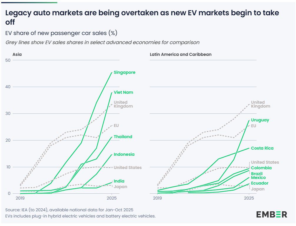The findings from Ember’s analysis reveal an important story of emerging markets rapidly overtaking EV shares in advanced economies and legacy automotive markets.