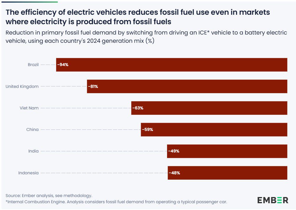 Ember’s analysis also highlighted the impact electrified vehicles are having on fossil fuel reliance in countries where EV sales are increasing.