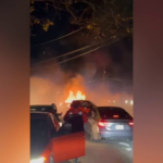 The car, a stolen vehicle, drove onto a walkway for pedestrians, the report said.