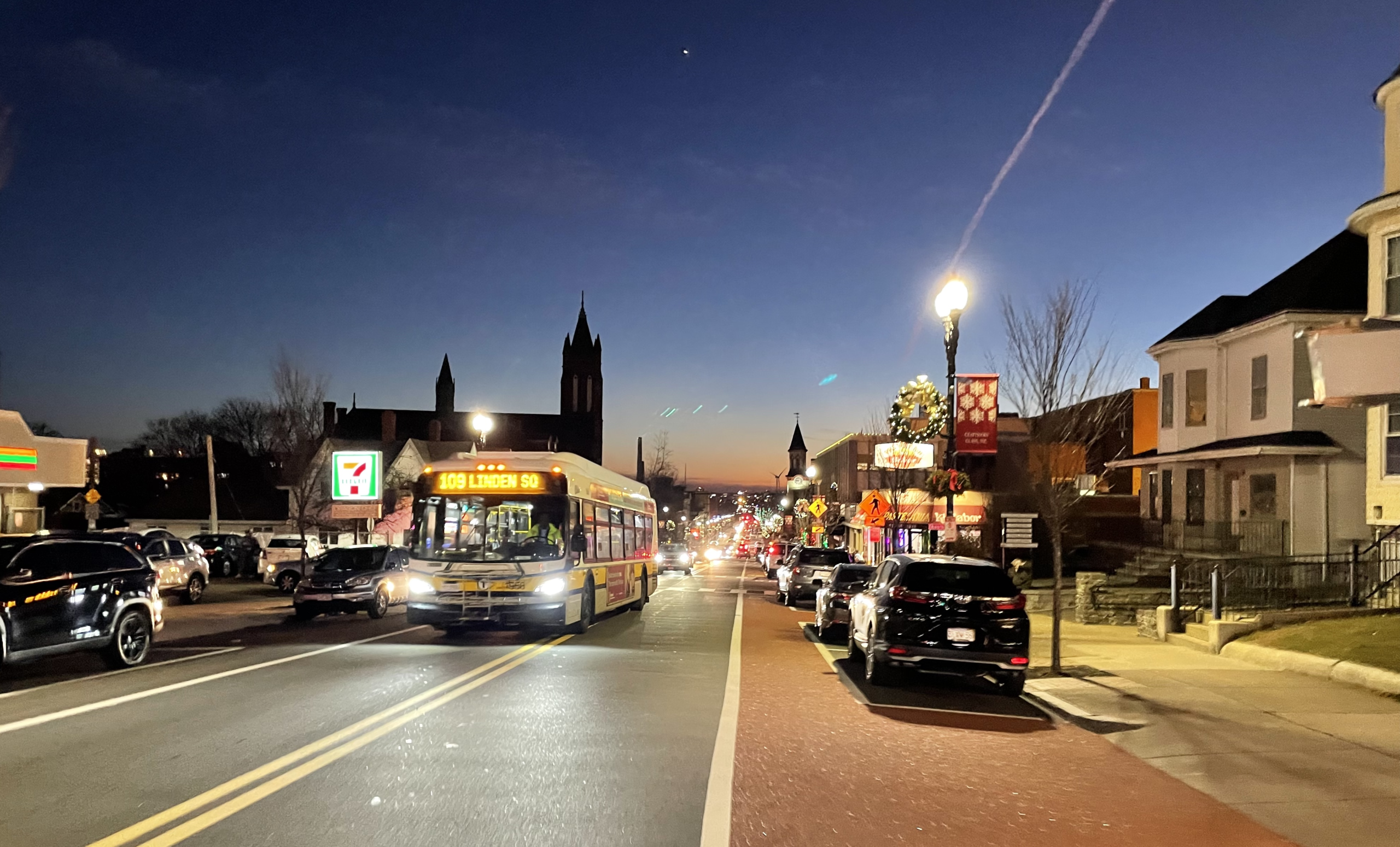 A MBTA 109 bus drives up Broadway in Everett at dusk on Tuesday, Nov. 17, 2024.