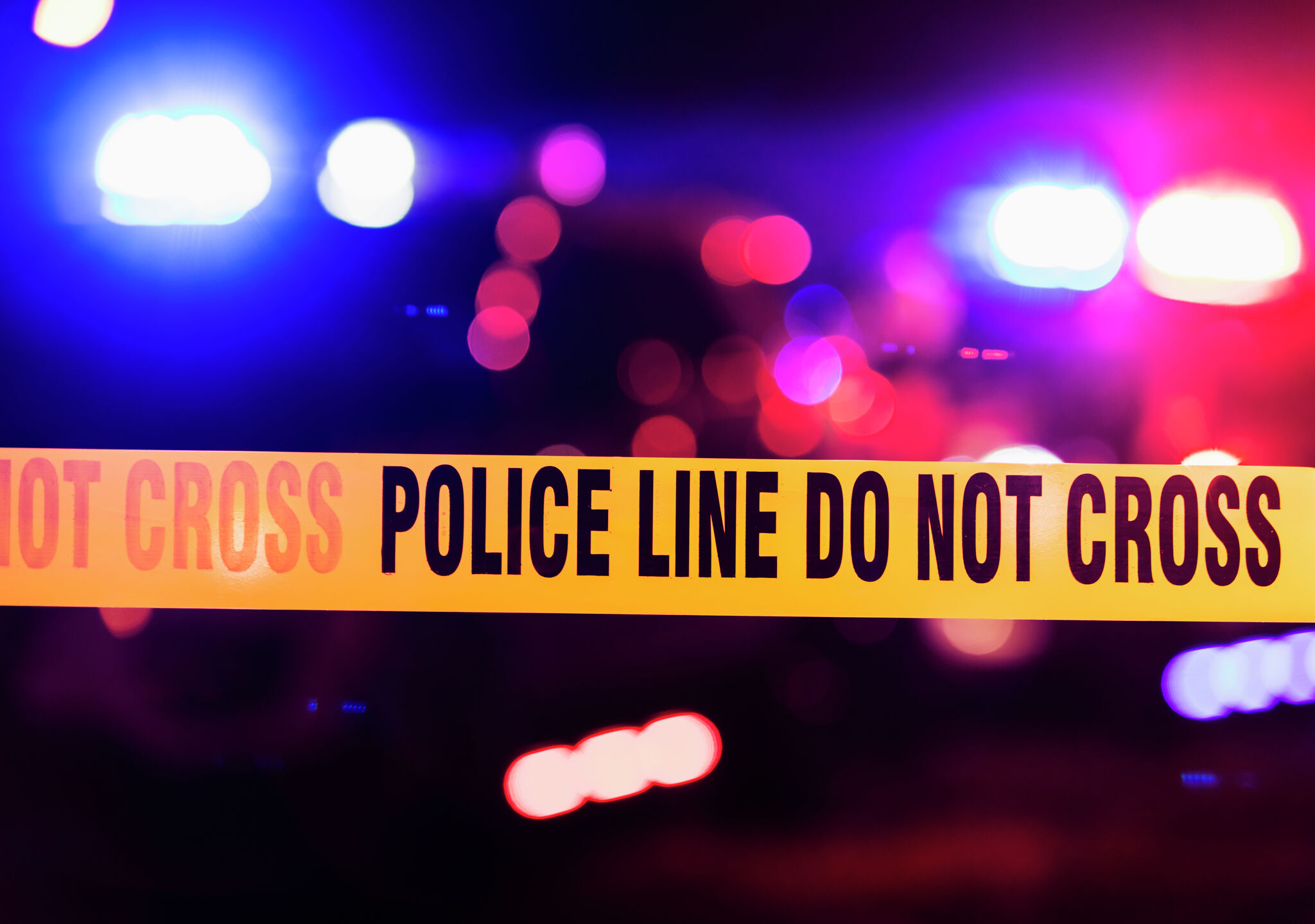 Accident or crime scene cordon tape, police line do not cross. It is nighttime, emergency lights of police cars flashing blue, red and white in the background