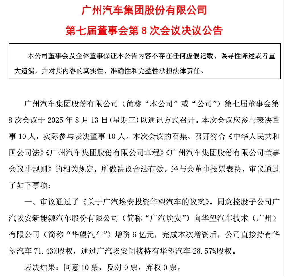 The GAC board of directors agrees to increase the capital of Huawang Automobile by 600 million yuan