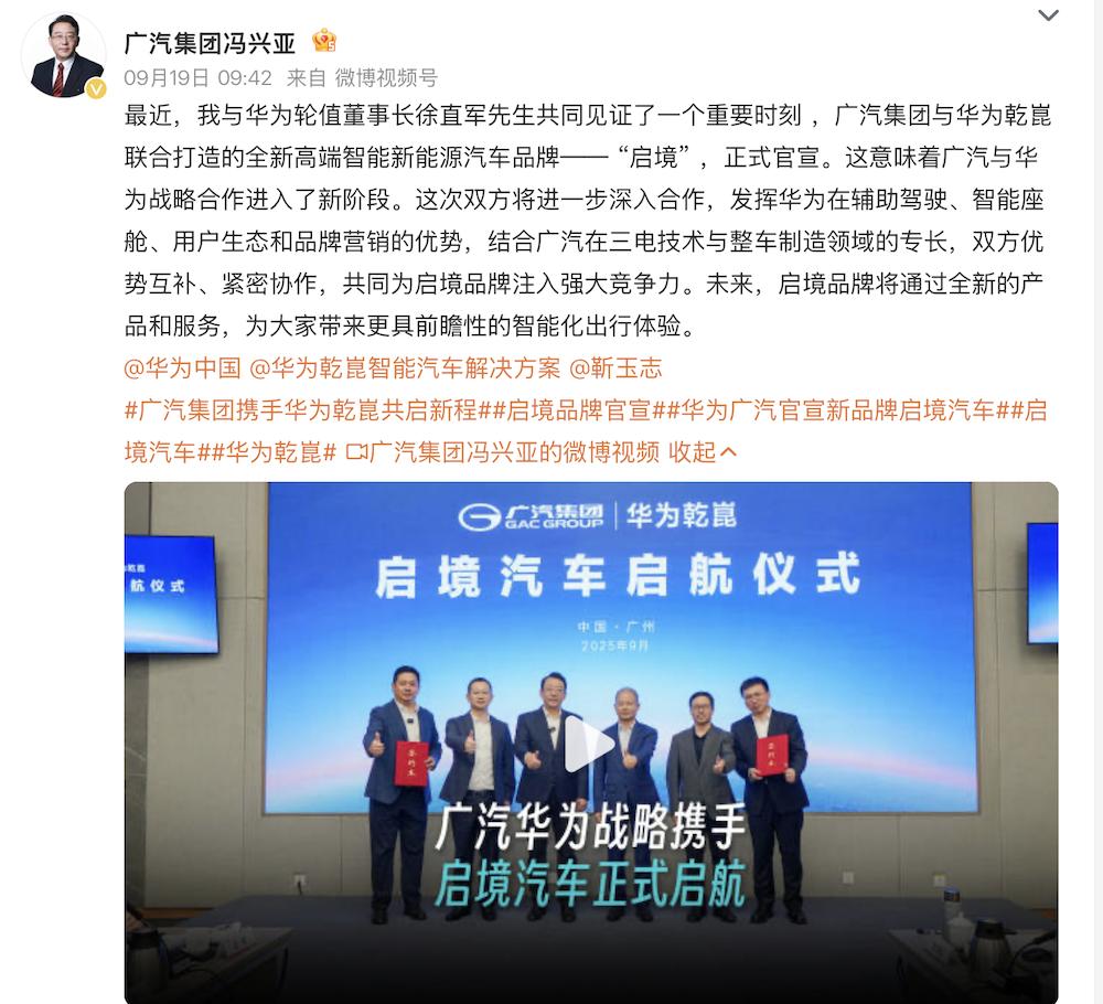 On September 25th, witnessed by Xu Zhijun, the rotating chairman of Huawei, and Feng Xingya, the chairman of GAC Group, the name “Qijing Automobile” was announced, and Liu Jiaming was appointed as the CEO of Qijing, who will be fully responsible for brand strategy, product planning, market expansion, and operation management.