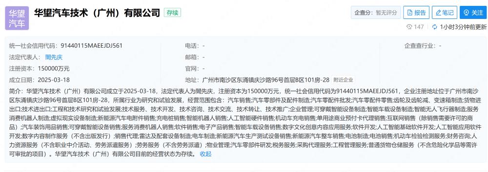 Before the announcement of the name “Qijing Automobile”, GAC Group established Huawang Automobile on March 18, 2025, with an investment of 1.5 billion yuan from GAC Group.