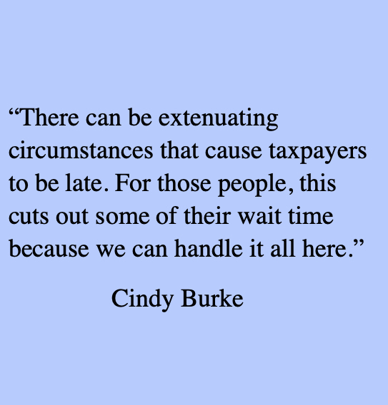 “We send the tax bills out a month and a half before they are due, so most people are on time, but there can be extenuating circumstances that cause taxpayers to be late,” she said. “For those people, this cuts out some of their wait time because we can handle it all here.”