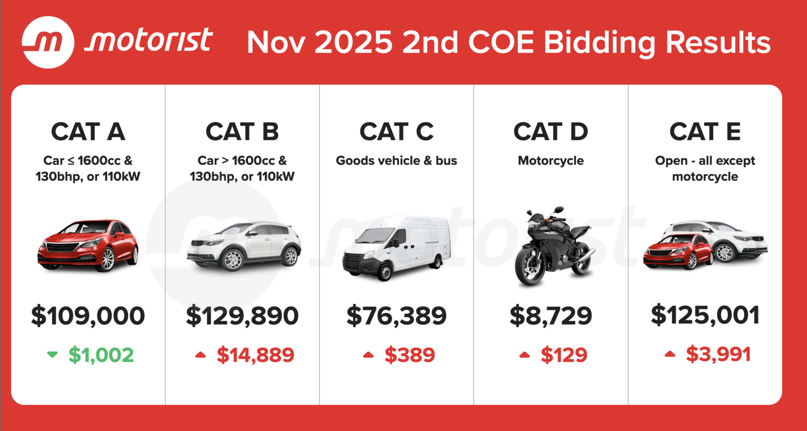 Read More: November 2025 COE Results 1st Bidding: The COE monster calmed down again, with big five-digit drops in the premiums for cars, while the price gap between Cat B and overcrowded Cat A was merely $5k