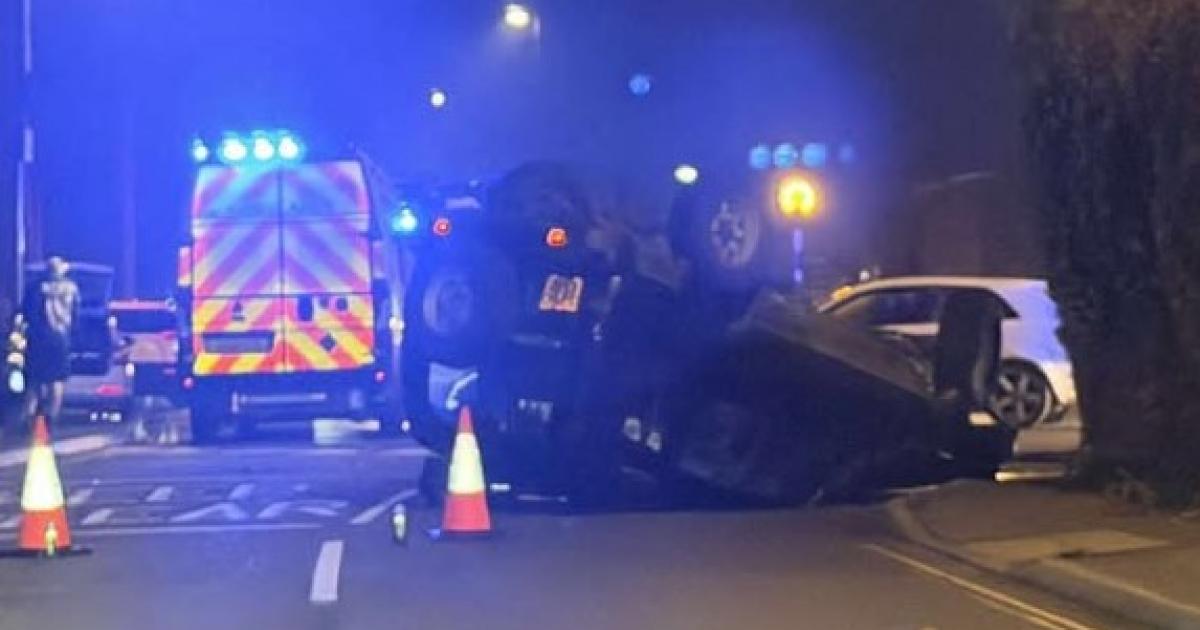 A whole host of emergency services rushed to Portsmouth Road at 7.40pm last night after two vehicles had crashed, leaving one black car overturned and positioned on its roof.