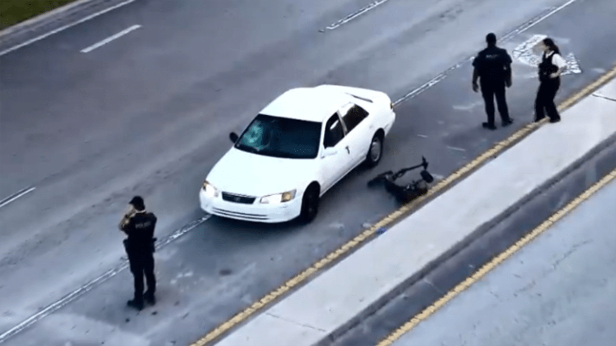 Aerial images showed the electric bike on the ground next to a white sedan that had a shattered windshield.
