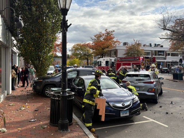 New Canaan Police, Fire and EMS were on scene attending to those involved in the crash while dozens of onlookers took photos and videos. Debris including broken glass and car parts could be seen in the roadway.