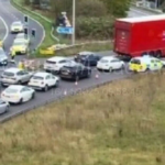 The road was closed in both directions, and a car could be seen appearing to have suffered serious damage and to have ended up in a ditch.