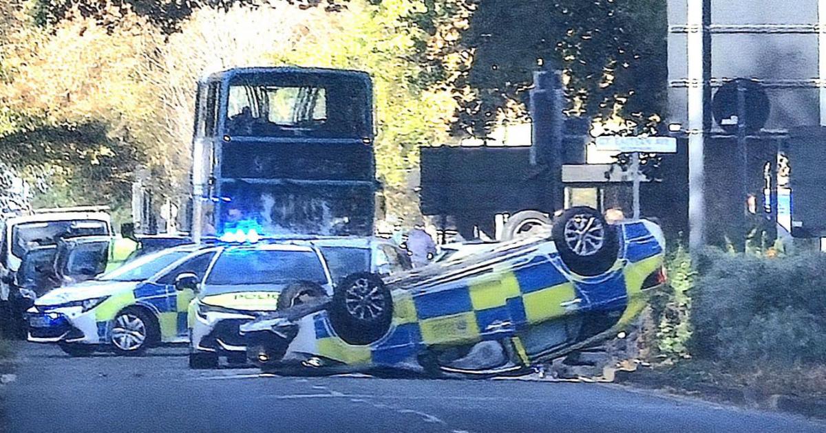 A POLICE car has flipped onto its roof on a busy Southend road following eyewitness reports of a crash.