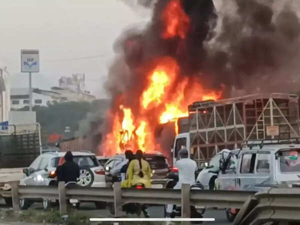 Pune Tragedy Live News Updates: Five killed as car gets crushed between 2 container trucks engulfed in flames in Pune