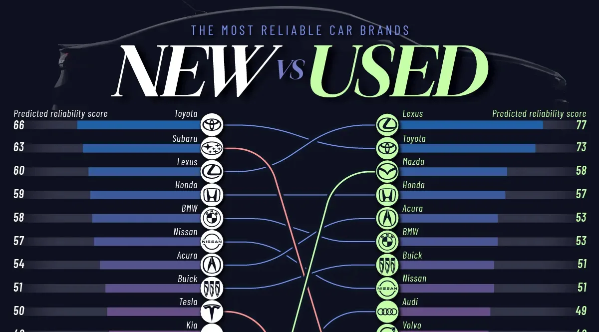 This graphic shows the most reliable new and used car brands in 2026, based on Consumer Reports data.