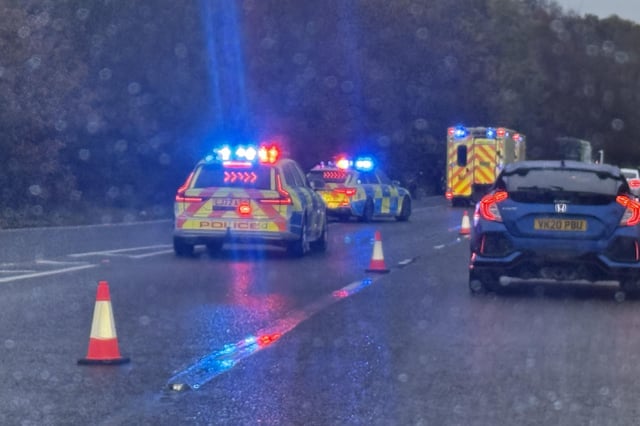 On the AA Roadwatch website, their report reads: Partially blocked and queueing traffic for three miles due to rolled-over car on A24 Southwater Bypass Northbound at B2237 Worthing Road (Hop Oast Park And Ride Roundabout).