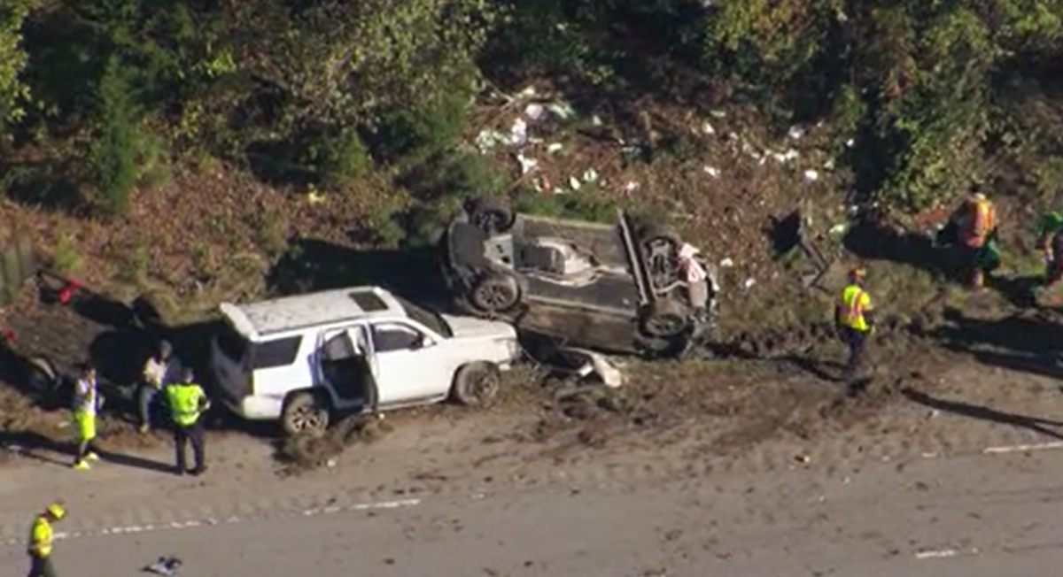 WRAL’s Sky 5 flew over the scene where at least two cars were seen off the right shoulder of the road. One was on top of the other, upside down.