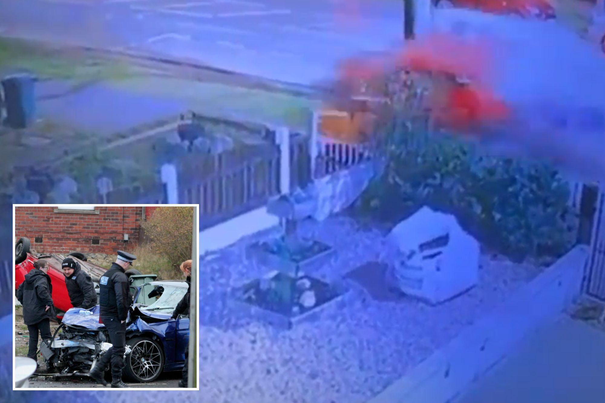 The impact was devastating with a red car seen launched into the air before it hits a wall and comes to rest on its roof.