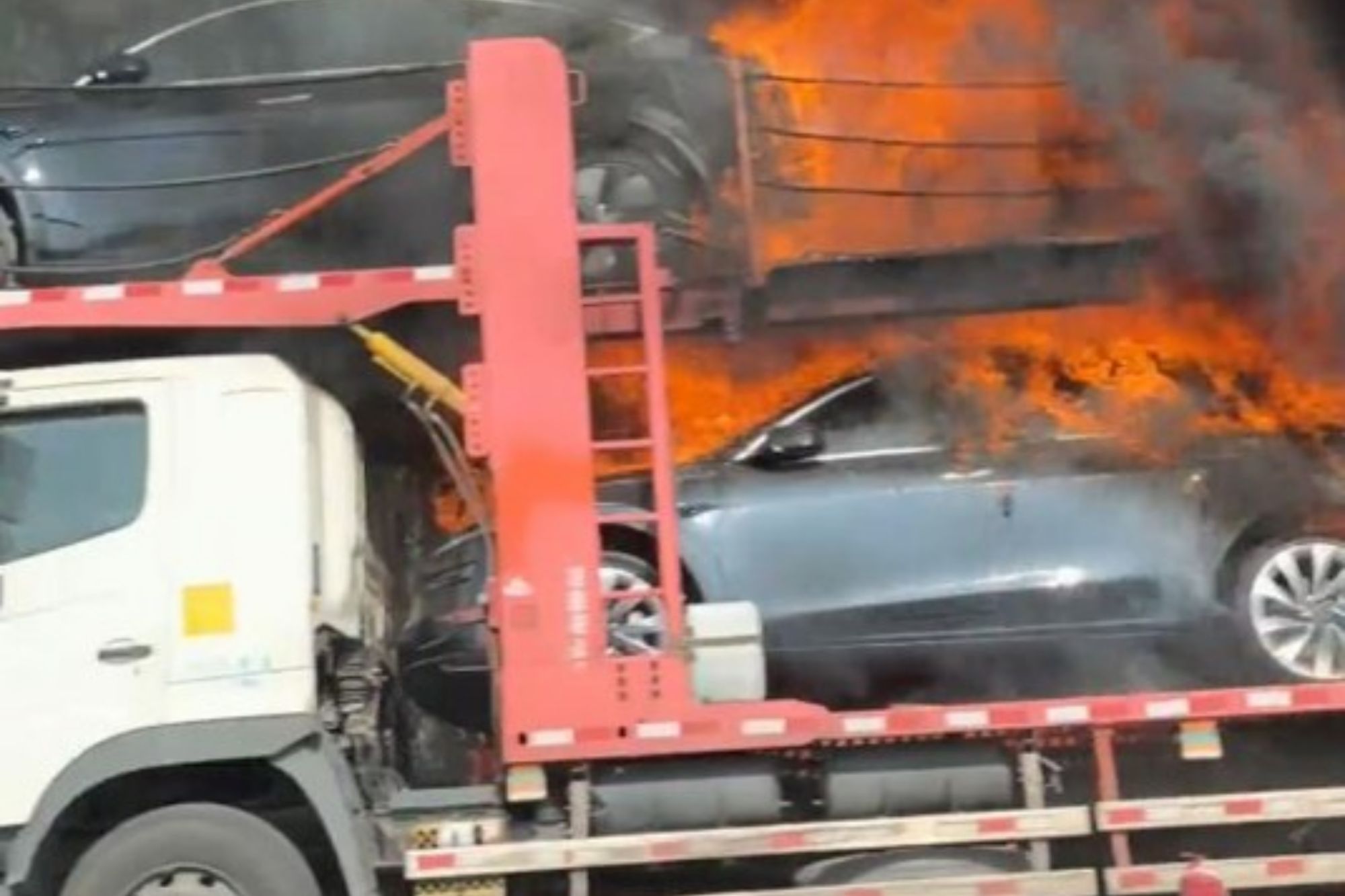 Footage shows several new cars branded as Teslas on the transporter as flames and dense smoke rise from both the flatbed and some of the vehicles loaded onto it.