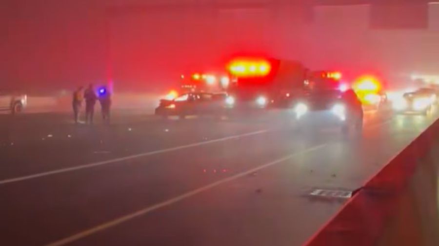 A photo of the six-car crash on I-5 in Tacoma amid dense fog. (Photo courtesy of Washington State Patrol)