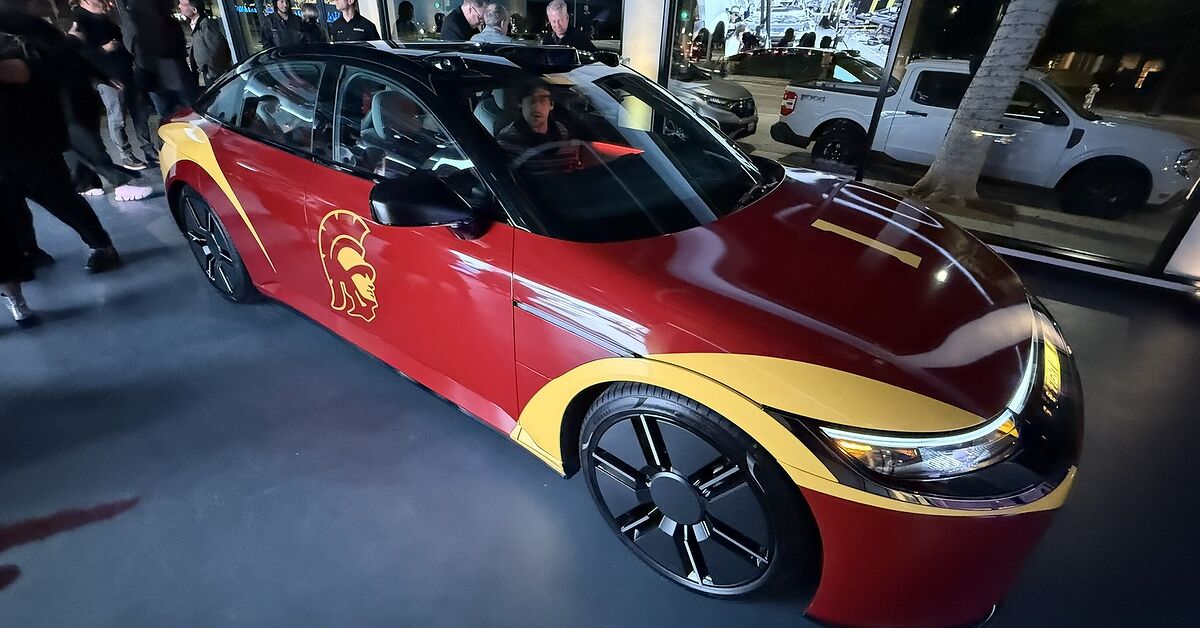 It all looks cool, even if it’s decked out in USC colors (I root for rival Notre Dame, so, ugh). The text bar is cool, though no word if you can use it to tell off other drivers who cut you off in traffic. The big side-to-side interior screen is particular intriguing, even if I shudder at the out-of-warranty repair costs. The Afeela looks small up close but it’s a bit larger than a Tesla Model 3, at least in terms of exterior dimension. The design is sleek, though the lidar protrusions ruin the flow a bit.
