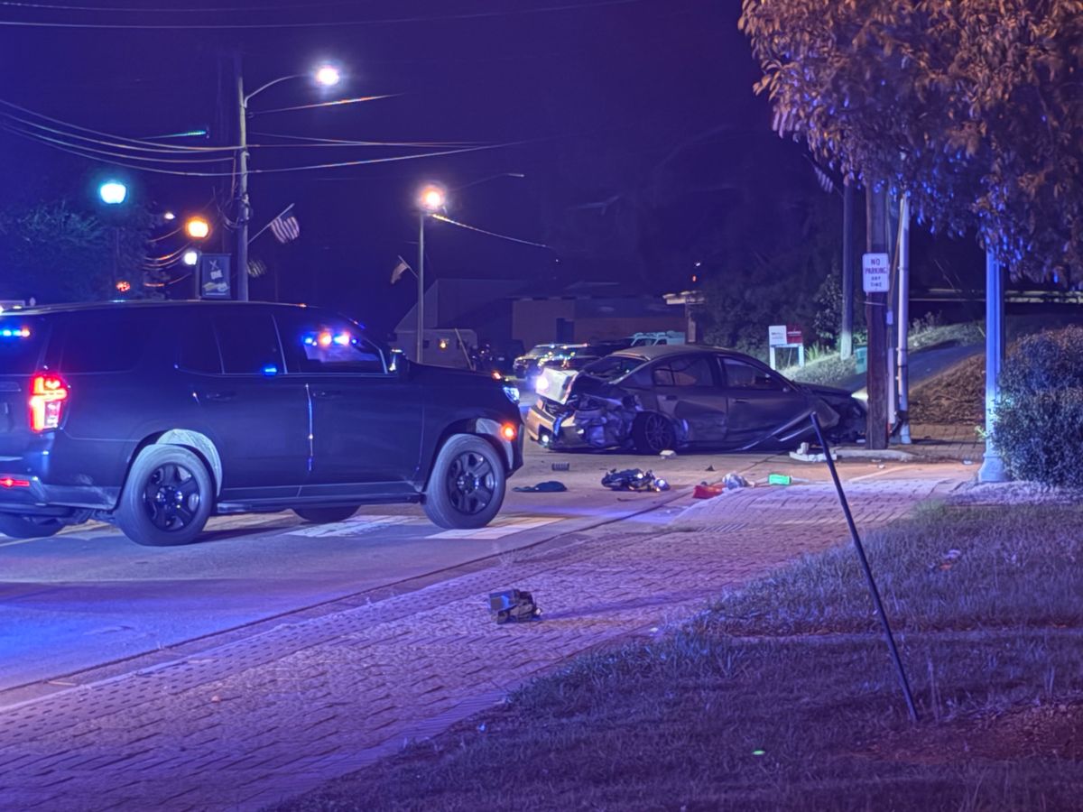 The WRAL Breaking News Tracker captured video of debris scattered across the street. There was damage to a wall and a lamp post. The car was badly damaged and pushed up against a utility pole.