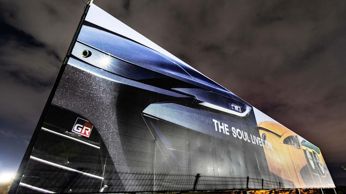 Toyota is teasing a new supercar with a billboard at Fuji Speedway, showing a small glimpse of the car's front end.