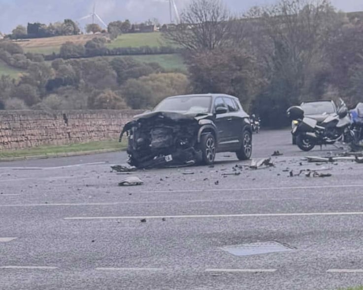 Photos show how a black car is in ruins at the junction of Treeton Lane and Ulley Lane following a crash sometime before 10am today (November 1).