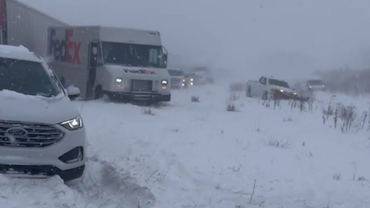 Footage captured by an eyewitness on the scene shows clusters of damaged cars and semi-trucks on a snowy Interstate 196, about 24 miles southwest of Grand Rapids, and along its shoulder, on Sunday, Jan. 19. Some of the vehicles even fused together upon impact.